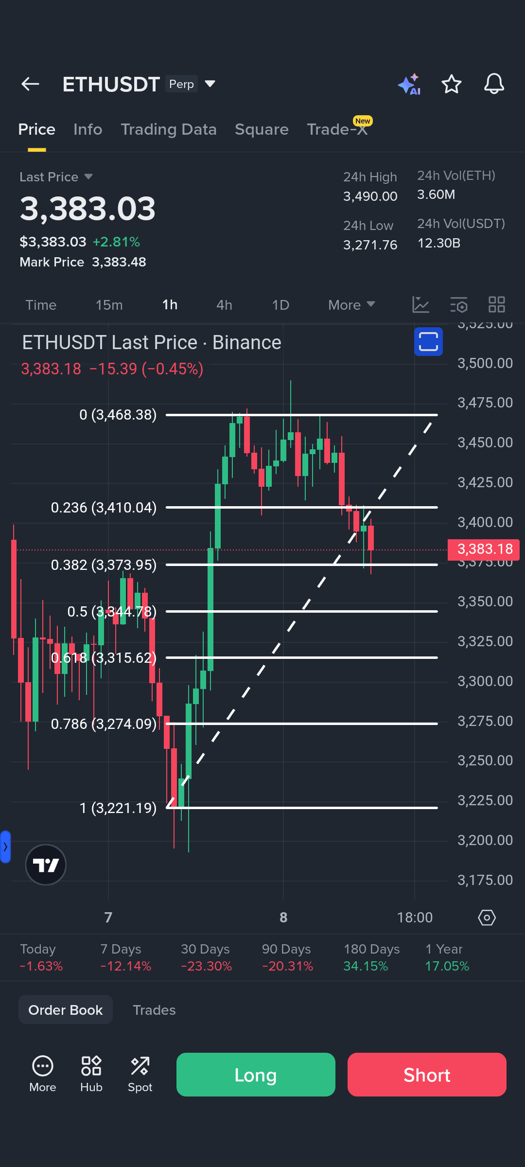 Je patrné, že cena ETH našla silnou podporu v rozmezí $3373, což odpovídá přesně retrakci 38.2%.