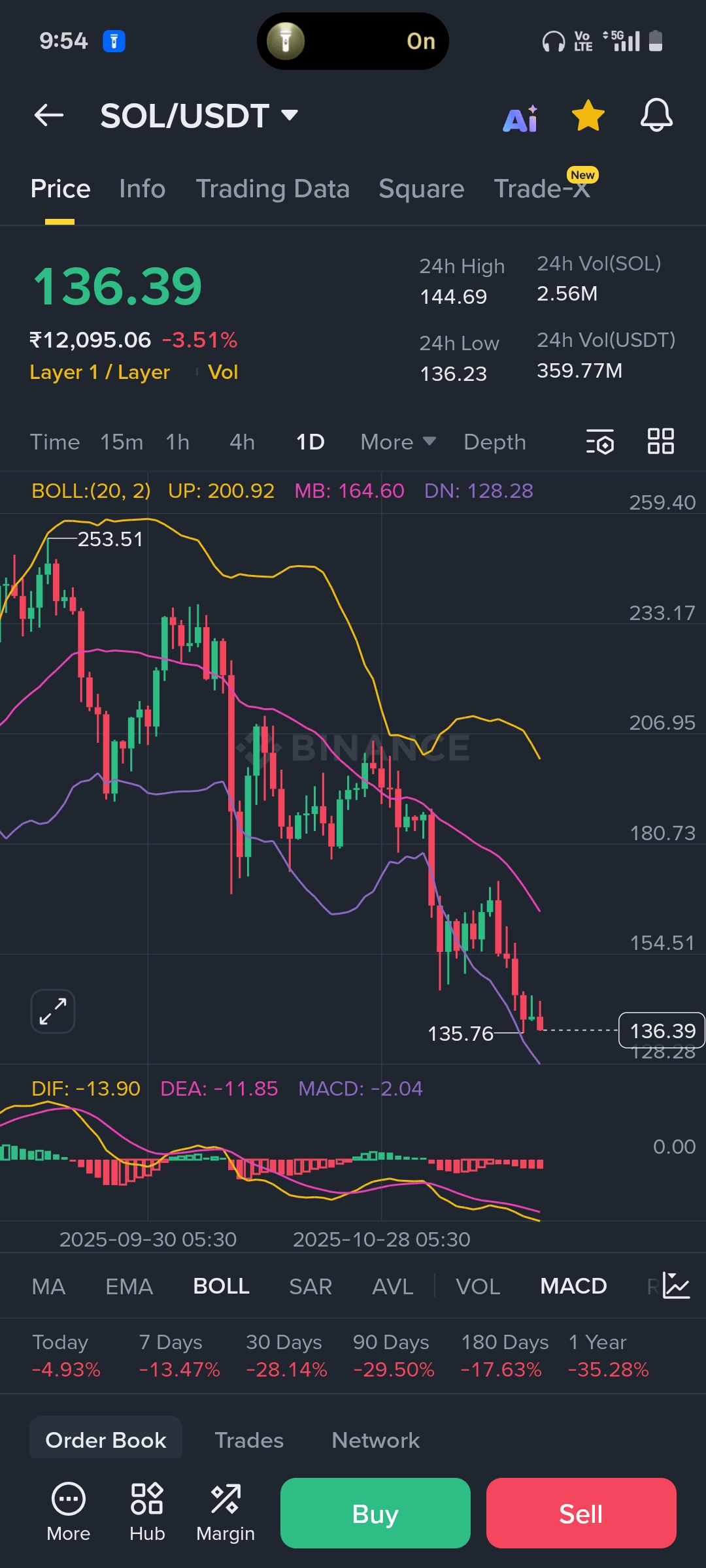 Cena akce:$SOL Cena je na 136.39 a aktuálně se obchoduje pod střední Bollingerovou kapelou (MB: 164.60) a velmi blízko k Dolní Bollingerově kapele (DN: 128.28).
