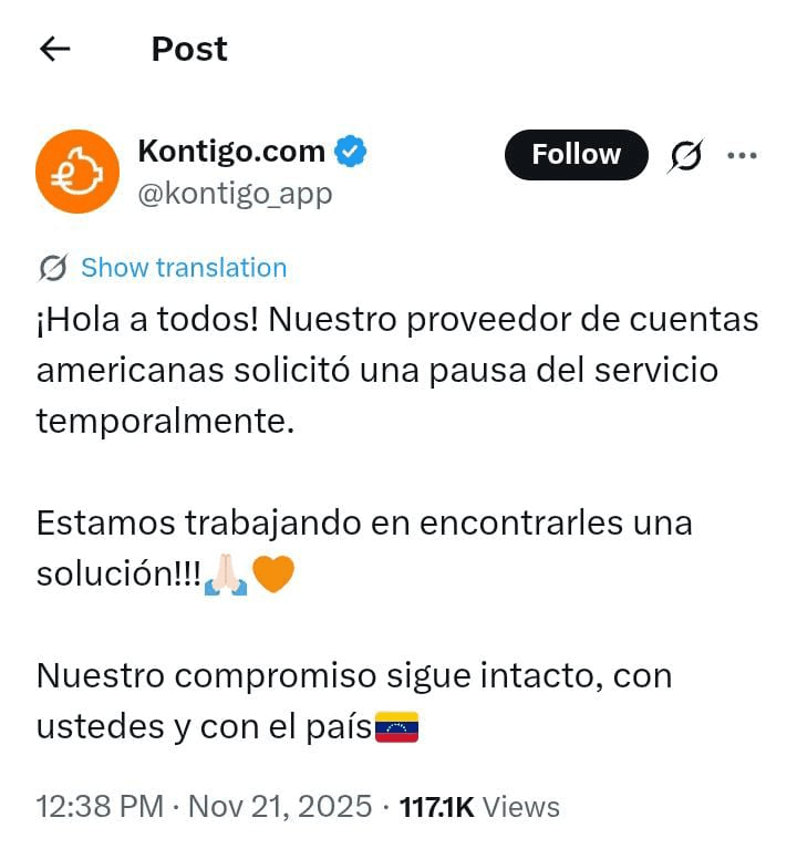 📌 Kontigo oznámilo, že jejich bankovní poskytovatel v USA požádal o zmrazení operací pro uživatele z Venezuely.