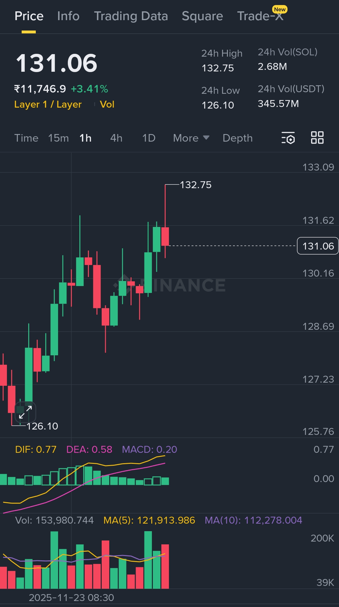 Nedávné odmítnutí maxima: Poslední dvě svíčky ukazují, že se cena snaží posunout k 24h maximu 132,75, ale nedokáže tuto úroveň udržet, což má za následek horní knot a návrat zpět k aktuální ceně 131,06. To naznačuje, že na trh vstupuje prodejní tlak na vrcholu.