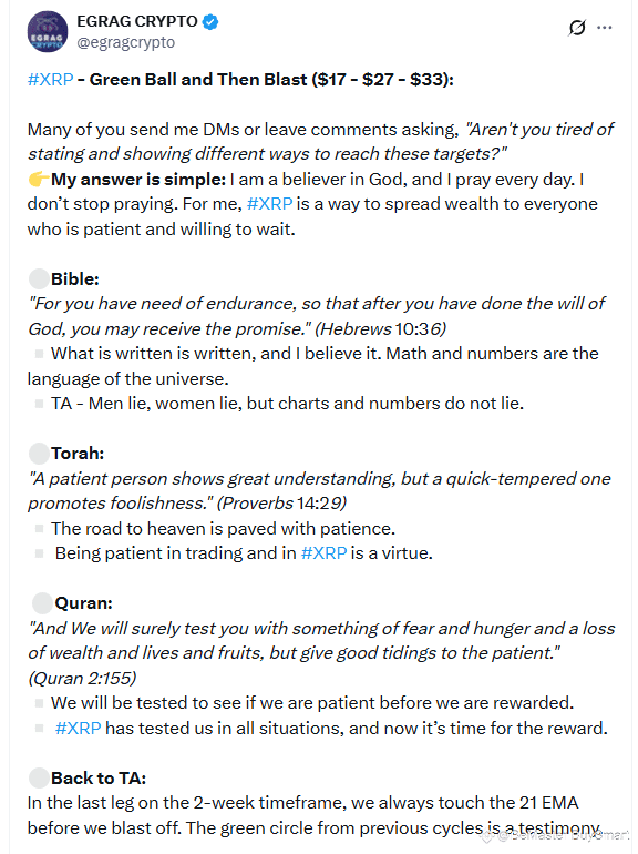Trvá na tom, že cíle cen v dvojciferných číslech až do 33 $ zůstávají realistickými očekáváními, i přes rostoucí mdlou náladu u dříve nerealizovaných prognóz. Jeho zpráva spojila technickou analýzu s osobní vírou, vyzývající k trpělivosti, víře a odolnosti držitelů XRP.