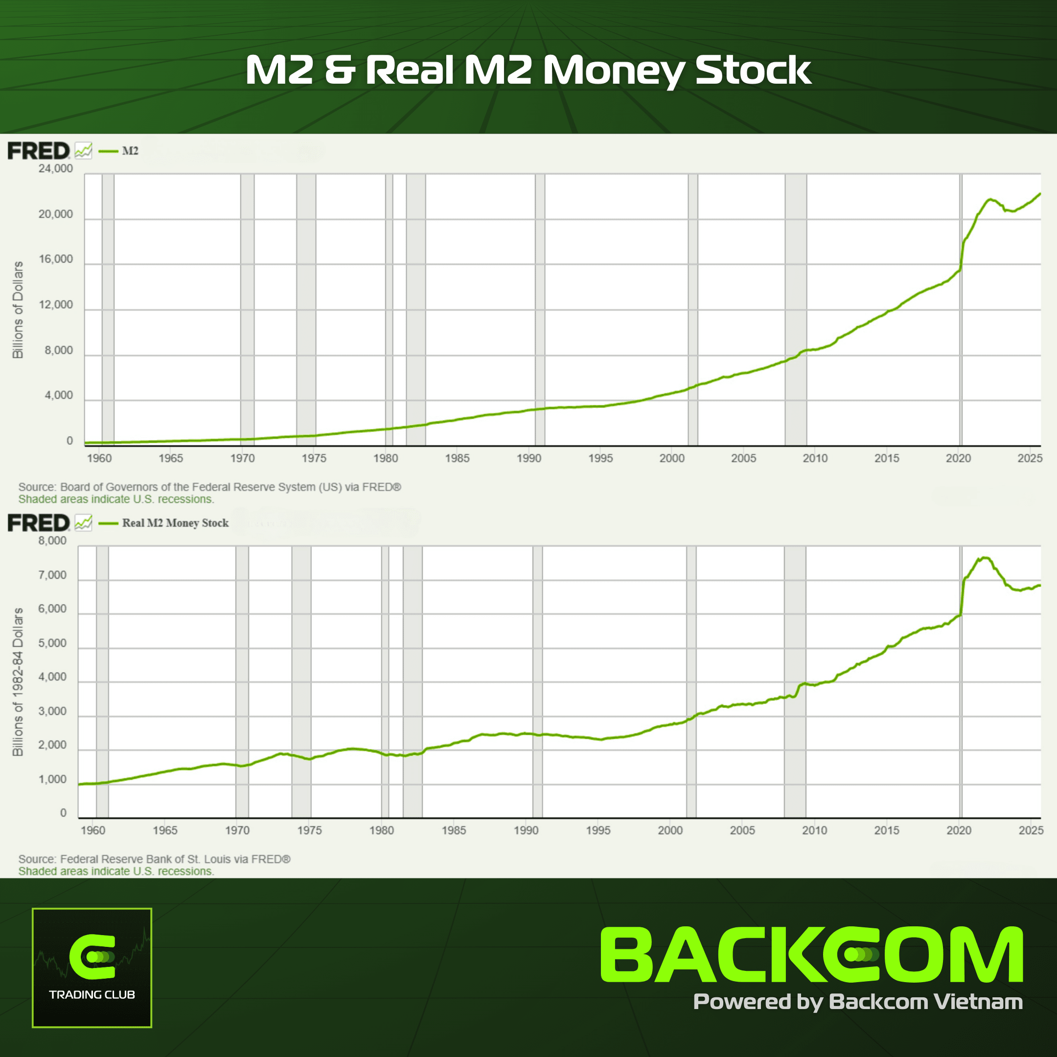 🔸 Nicméně, reálné M2 - množství peněz po odečtení inflace, je stále zřetelně slabší než vrchol v roce 2021.