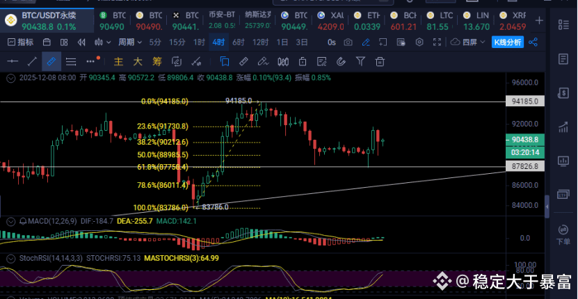 昨日夜间测试87750美元(对应83700-94100区间61.8%斐波那契回撤位)后反弹。
