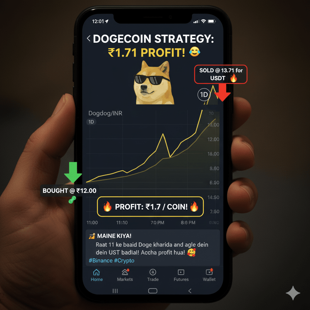 Maine yahi mauka pakda! Maine v noci ve 11:00 PM přesně po Dogecoin koupil, když byla cena nízká, a další den jsem to převedl na Profit v USDT! 💵 Z této doby jsem měl docela dobrý ROI.