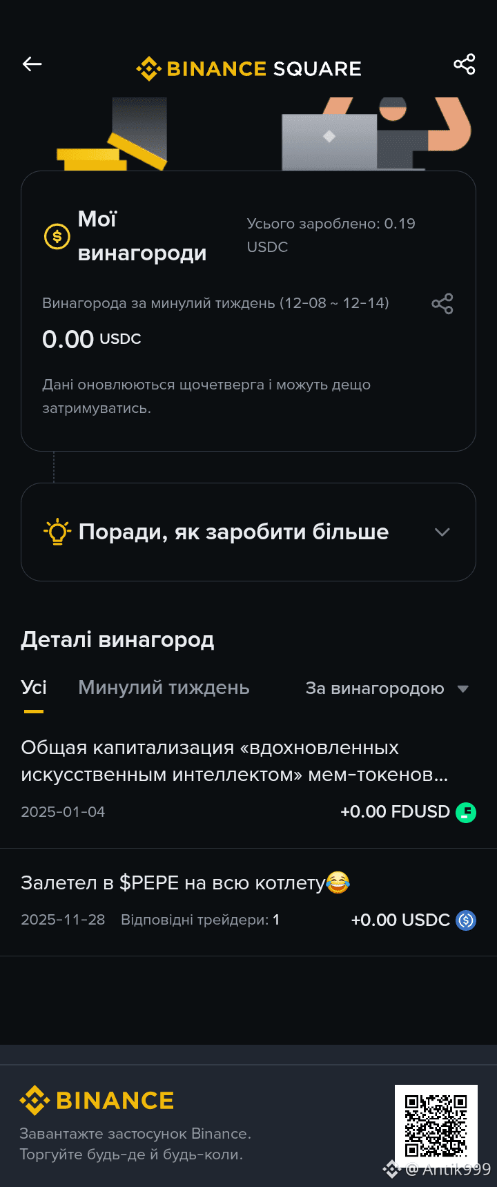 ​Награды не приходят сразу: Как видно на моем скриншоте, вознаграждение может составлять 0.00 USDC или 0.00 FDUSD даже за популярные темы вроде мем-коинов. Награды зависят от объема торгов ваших читателей, а не просто от количества лайков.
