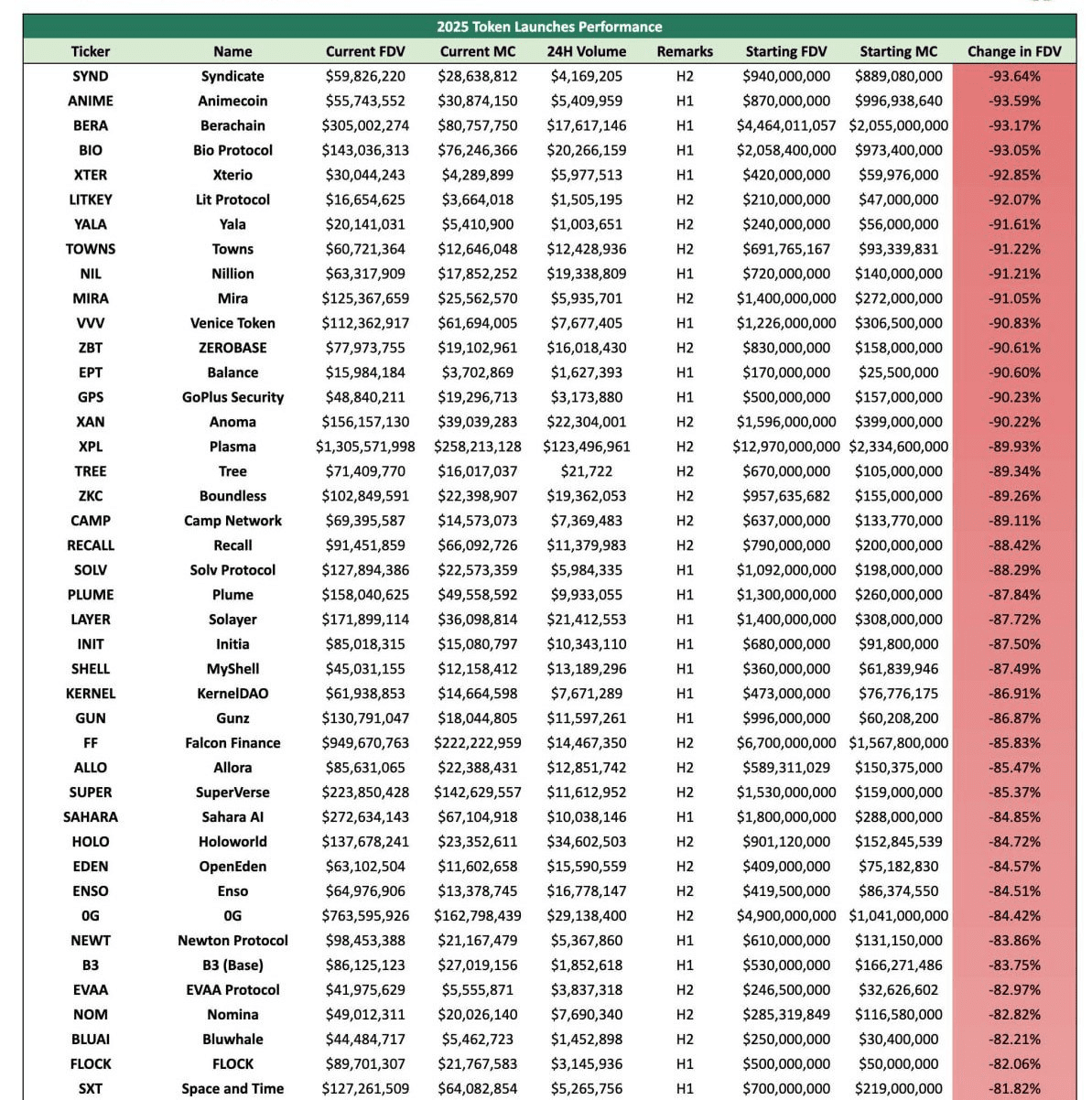 Většina těchto tokenů byla uvedena s plně zředěnými oceněními, která předpokládala budoucí úspěch jako danost. Stovky milionů, někdy miliardy, byly oceněny ještě předtím, než existovali skuteční uživatelé, příjmy nebo trvalá poptávka. Tato čísla byla více poháněna benchmarky soukromých kol a narativním hype než základy a veřejný trh je nakonec odmítl.