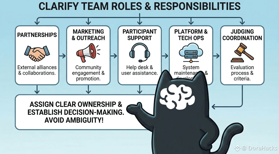Whether you're building a team from scratch or working within an existing organization, get clear on who does what. Typical roles include partnerships, marketing and community outreach, participant support, platform and technical operations, and judging coordination.