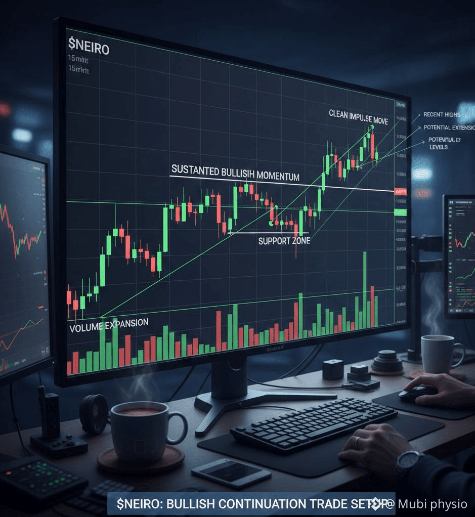 $NEIRO is showing convincing follow-through after a clean impulse move on the 15-minute chart, signaling sustained bullish momentum. Price action is holding firmly above the prior consolidation range, which has now flipped into a support zone—an encouraging sign that buyers remain in control.