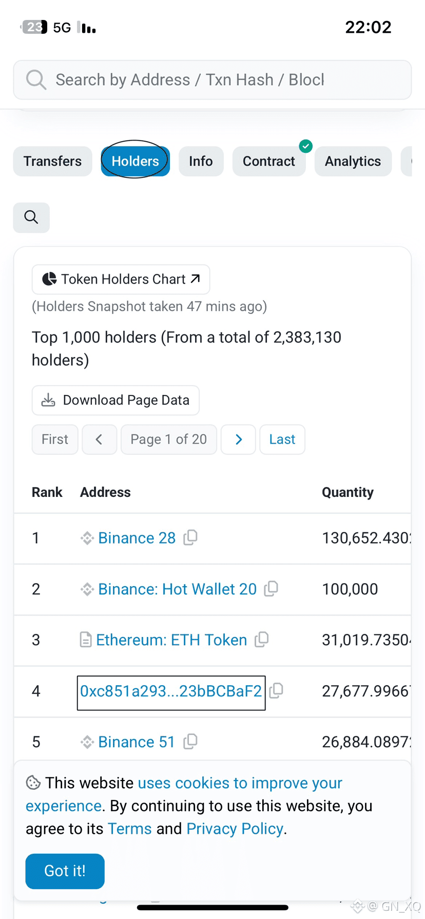 بعد فتح BscScan، انزل قليلًا حتى تجد Transfers وجانبها Holders. بالضغط على Holders ستظهر لك جميع محافظ الحيتان التي تملك ETH.