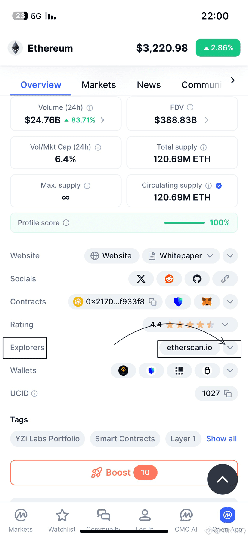 اضغط على Ethereum لتظهر لك الصفحة الخاصة بالعملة، ثم انزل قليلًا حتى تصل إلى قسم Explorers.