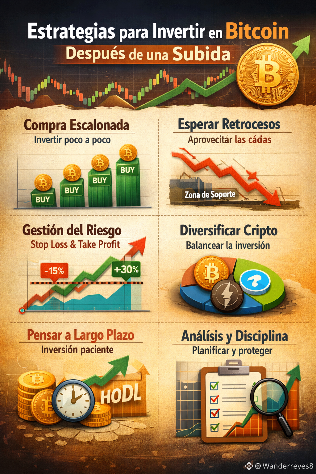 Luego de una subida fuerte de $BTC Bitcoin, la forma de invertir cambia y debe ser más estratégica y cuidadosa. Ya no es recomendable entrar de manera impulsiva, sino hacerlo con planificación. Una de las principales estrategias es **la compra escalonada**, que consiste en invertir el capital poco a poco y no todo al mismo tiempo. Esto permite aprovechar posibles correcciones del precio y reducir el riesgo de comprar justo en un punto alto.