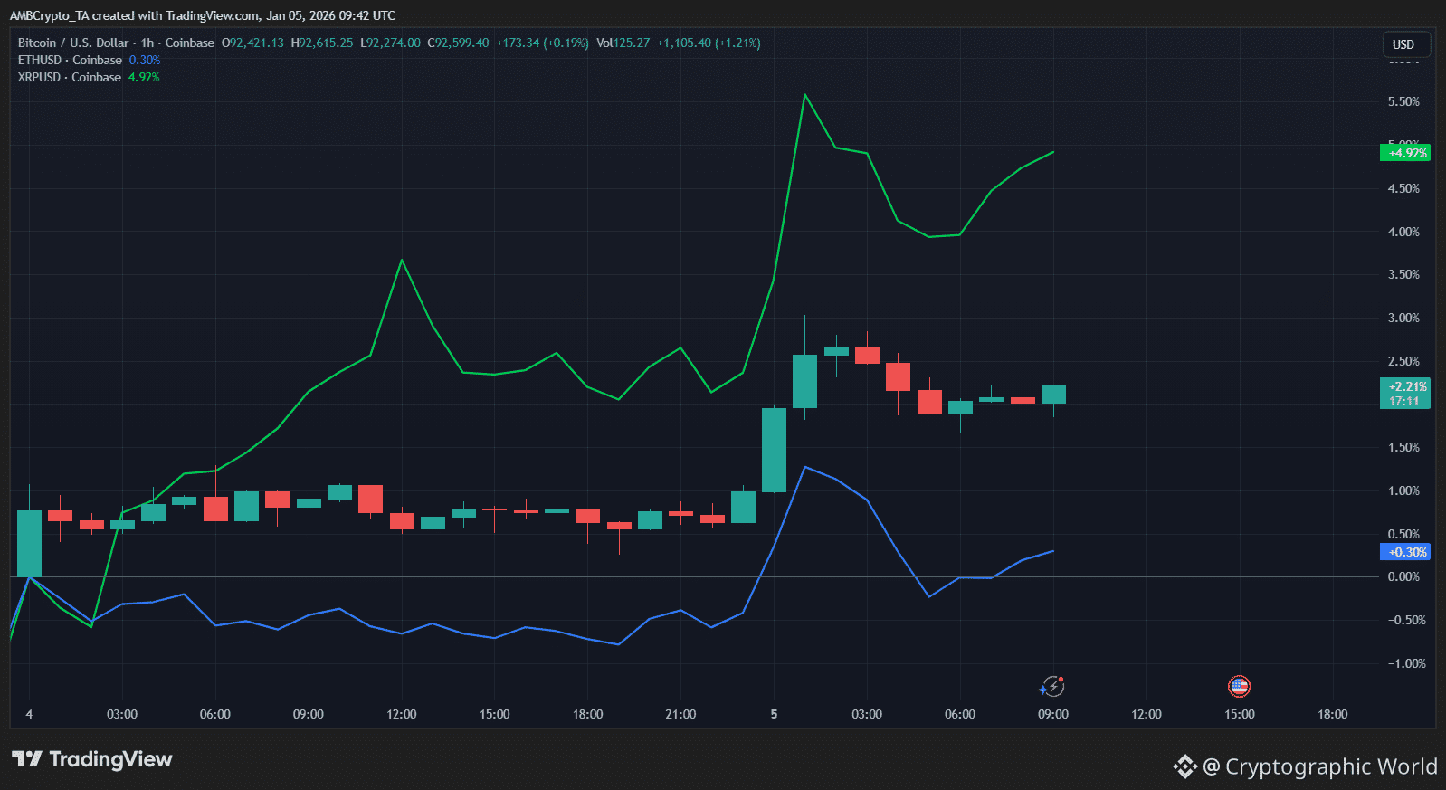Bitcoin has held above recent support levels and pushed upward, so buyers are willing to step in. Ethereum has also posted steady gains. However, Ripple [XRP] has been the standout, climbing up and outperforming both BTC and ETH in the short term.
