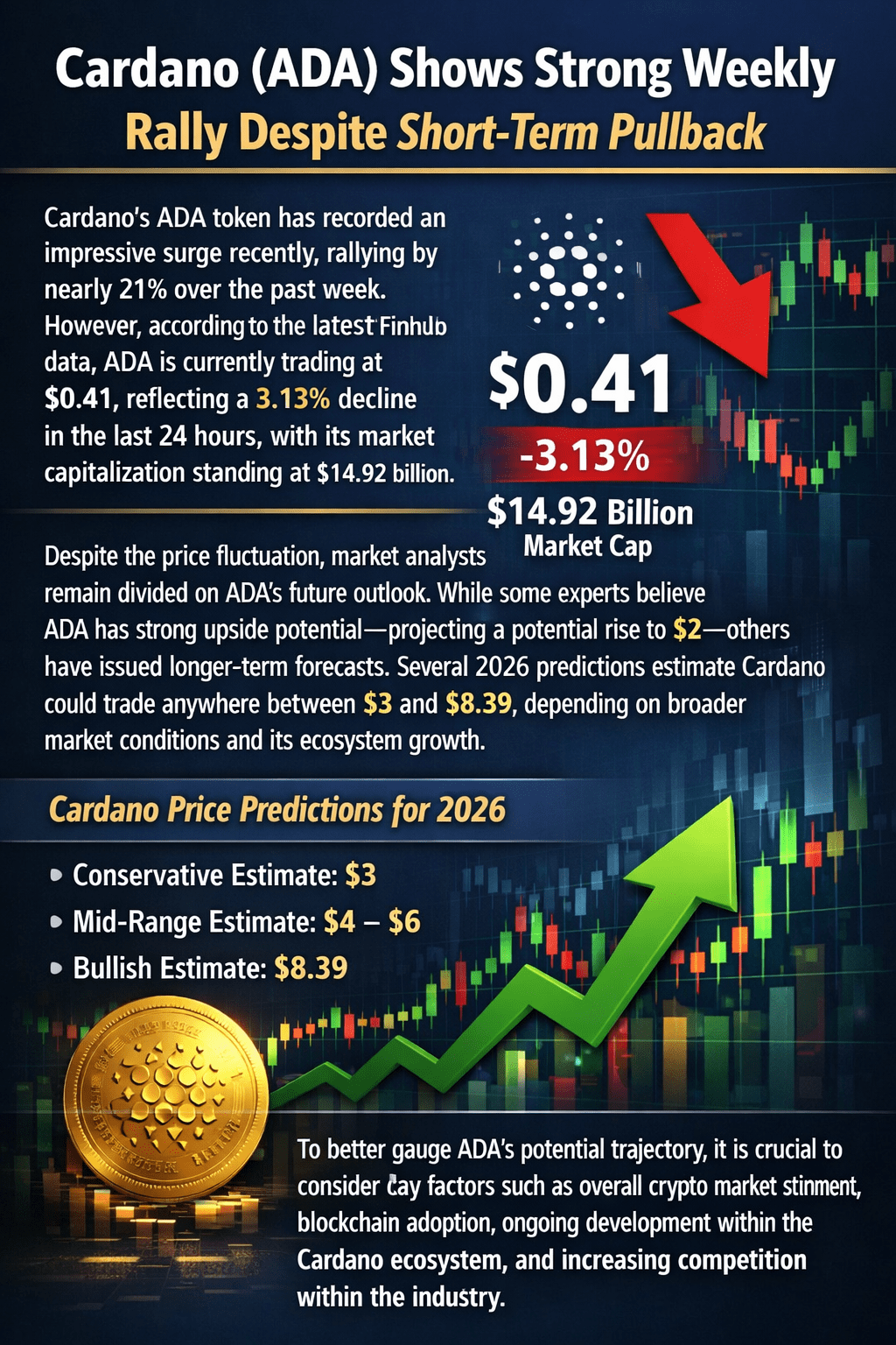 Přes kolísání cen jsou trhoví analytici rozděleni ohledně budoucnosti ADA. Zatímco někteří odborníci věří, že ADA má silný potenciál růstu – předpokládají možný nárůst na **2 $** – jiní vydali dlouhodobé prognózy. Několik předpovědí pro rok 2026 odhaduje, že Cardano se bude obchodovat mezi **3 a 8,39 $**, podle širších tržních podmínek a růstu své ekosystému.