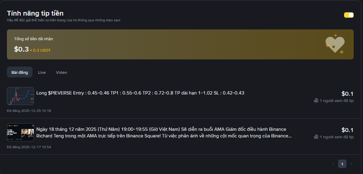 Kromě funkce připnutí mince máte i funkci tipu. Můžete získávat peníze od ostatních, kteří vám dávají tipy za vaše příspěvky nebo během streamování