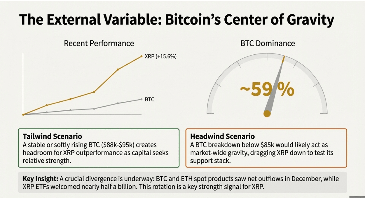BTC dominance is flirting with 59 percent, yet ETF flow divergence says capital is already tiptoeing out along the risk curve: BTC and ETH spot products saw December net outflows near 1.6 billion USD, while XRP ETFs welcomed nearly half a billion. If Bitcoin stalls below 95 kUSD, traders may keep hunting relative strength plays such as XRP. A Bitcoin breakdown below 85 kUSD, however, would likely drag every risk asset with it and test XRP’s support stack.