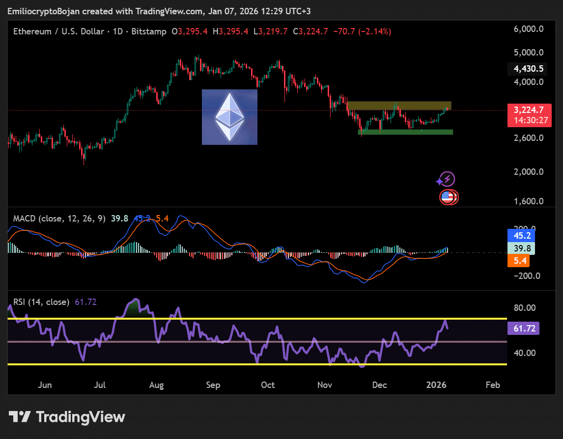 7. ledna 2026 se Ethereum vystoupalo až na klíčovou odporovou oblast 3200–3400 USD, trh se na chvíli zastavil. Všichni se ptají: Dokáže to překonat? Nebo bude případná korekce?