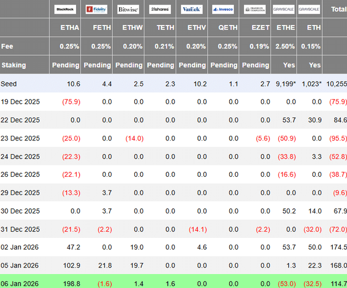 Nejenom jednotliví velkým investoři, ale i instituce nejsou zpátky. 6. ledna přišlo na ETF Ethereum rekordních 114 milionů USD přílivu kapitálu, což výrazně podpořilo růst ceny ETH.