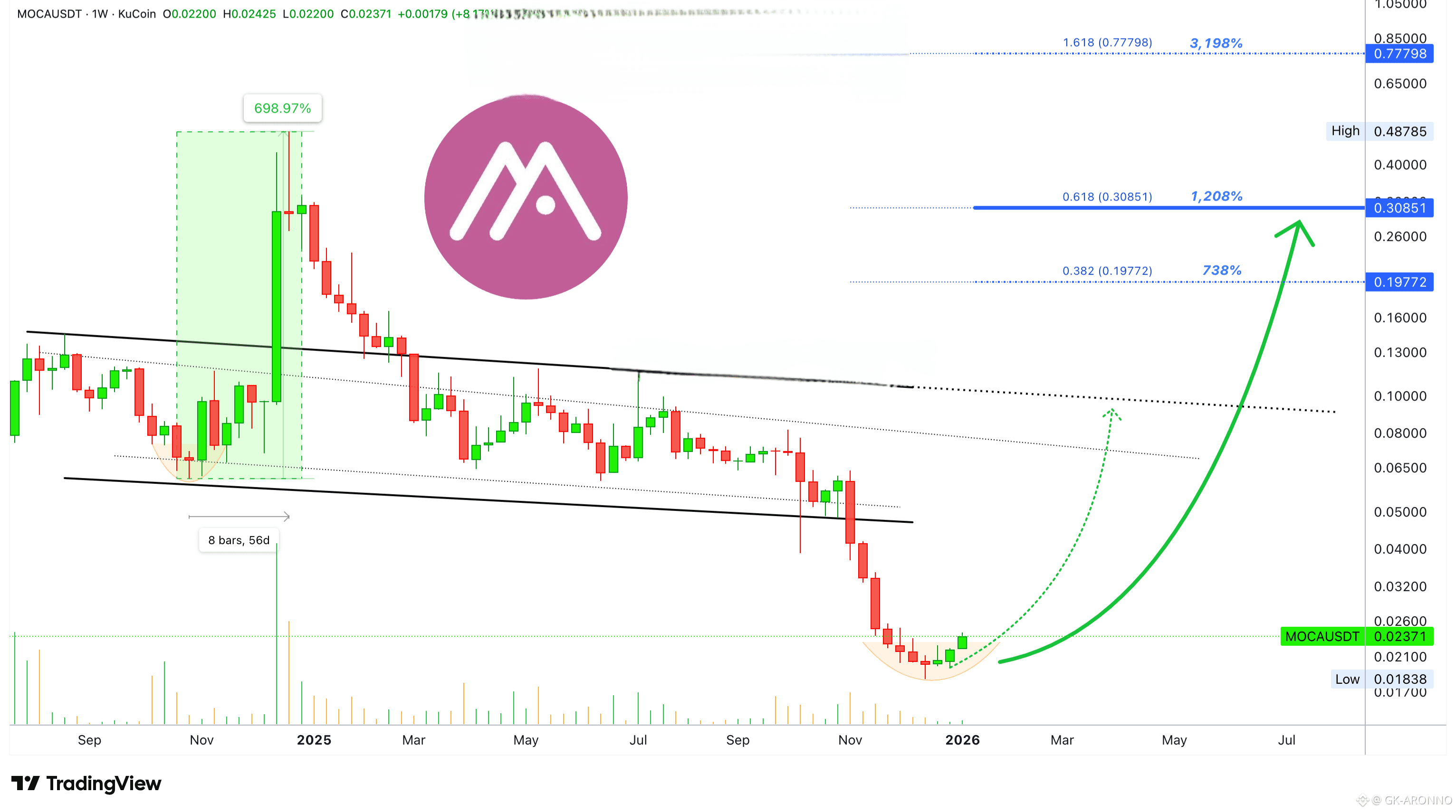 Let's start with the past to see what is possible. In just 8 weeks, 56 days, MOCAUSDT grew 700% late 2024. The low happened in October and the high late December.