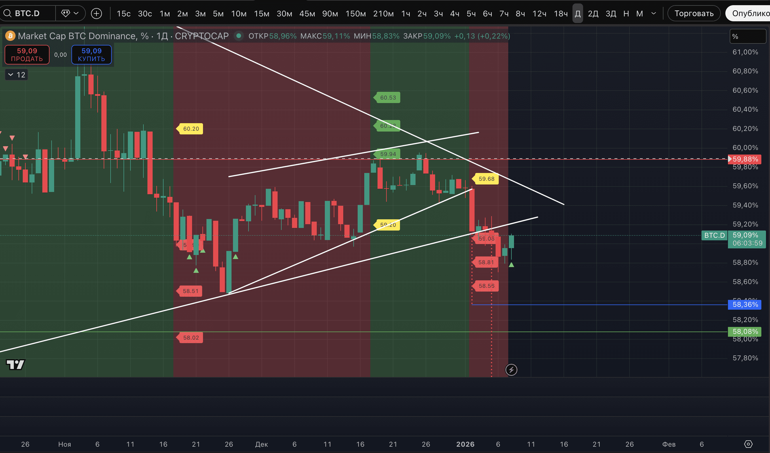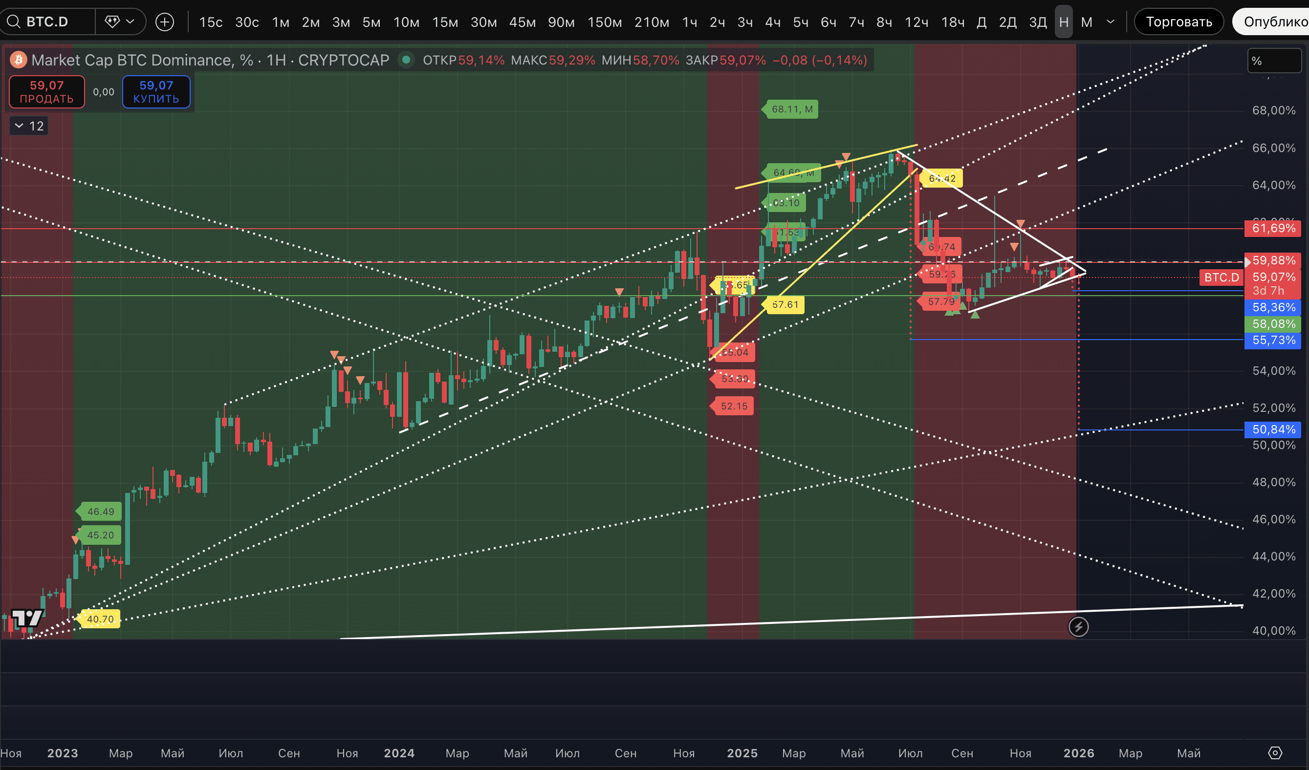 Všimněme si, že od minulého přehledu 3. ledna aktiv potvrdil výstup z rozsáhlého „Trojúhelníku“, který se tvořil od června 2025. A nyní byl prolomen dolů. Pravděpodobně nyní probíhá retest tohoto prolomení. Pokud by se to stalo dnes, byla by to úroveň 59,20 %. A plně upřesněná cílová oblast odpracování tvary je okolí 50,84 %.