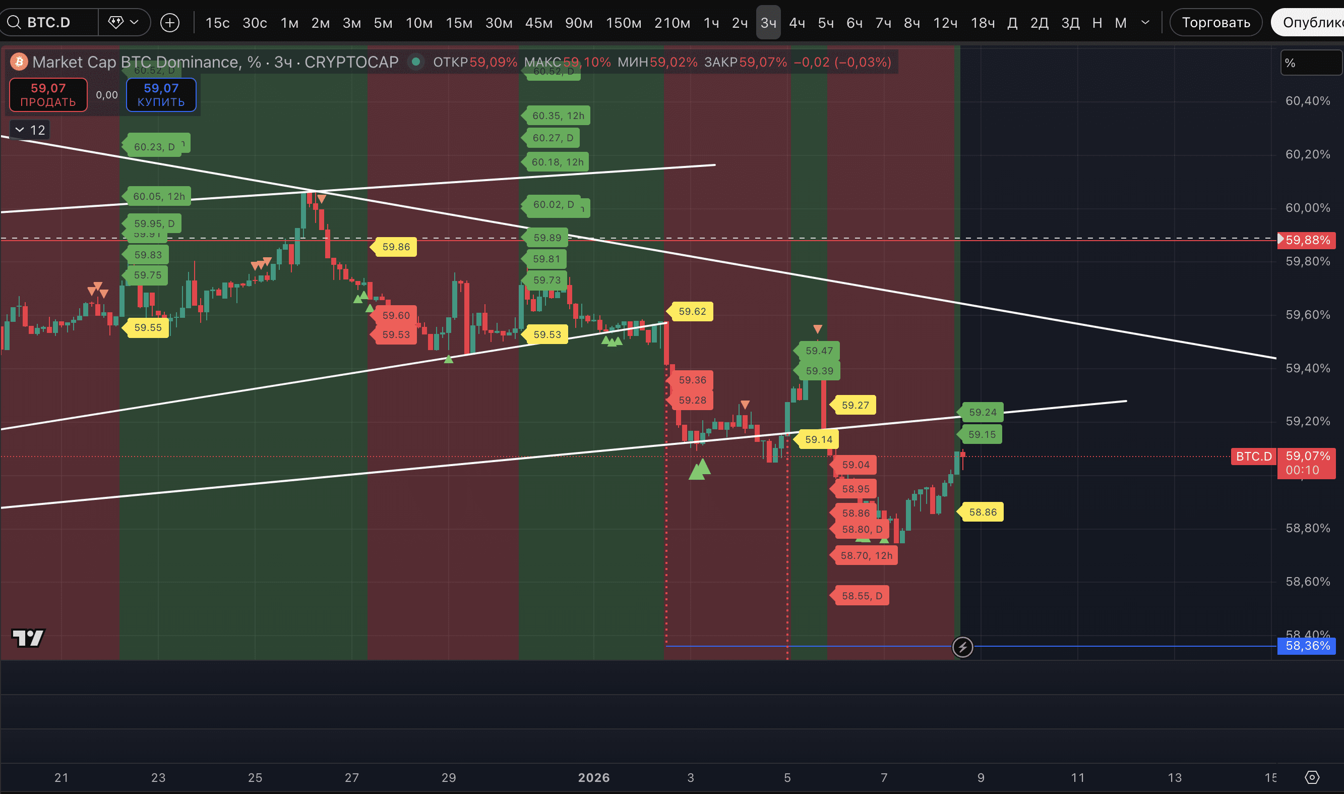 Jak se daří dominanci BTC 8. ledna? Tam začne odraz. A to s potvrzením ve formě značky potenciálního loje na denním časovém rámci, dnes poprvé. Proto očekáváme, že se trend odrazu bude rozvíjet v následujících dnech, pokud získá potvrzení ve formě uptrendu na čtyřhodinovém a vyšších časových rámcích. Zatím tam žádné uptrendy nejsou. Nejstarší je na tříhodinovém.