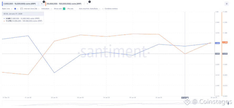 On-chain data confirms that the "smart money" isn't waiting for the breakout; they are creating it. Since January 5, whales holding between 10 million and 100 million XRP have added roughly 60 million tokens to their stacks an investment worth approximately $130 million at current market prices. This cohort, alongside smaller whales (1M–10M XRP), has been consistently buying into price dips, signaling deep conviction in the long-term structural setup. By accumulating during the formation of the "right shoulder," these institutional-grade players are providing the necessary floor to prevent a breakdown below the critical $1.77 support level.