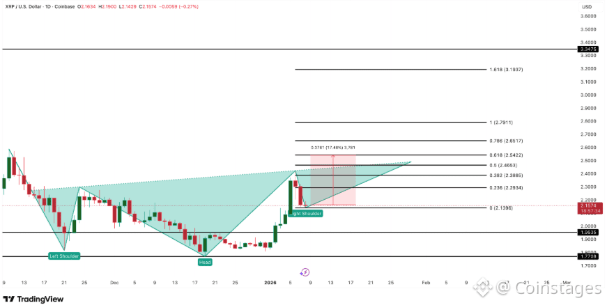 XRP’s technical chart is currently a masterpiece of accumulation. The price action is in the final stages of forming the "right shoulder" of a large-scale Inverse Head-and-Shoulders pattern. This structure is further bolstered by a looming "Golden Cross," as the 20-day exponential moving average (EMA) races to overtake the 50-day EMA. Historically, this crossover confirms that short-term momentum is shifting in favor of the bulls. If XRP can secure a daily close above $2.54, the pattern will be officially validated, unlocking a measured move that targets $3.19 and eventually $3.34 a significant leap from current consolidation levels.