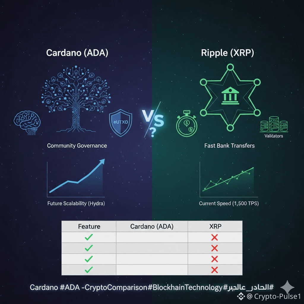 وجه المقارنةكاردانو (ADA)ريبل (XRP)المتفوقعدد العقد (Nodes)+3000 (لامركزية عالية)~150 (مركزية نسبياً)ADAالاستهلاك الطاقي0.0006 TWh (منخفض جداً)0.00001 TWh (منخفض جداً)تعادلسرعة المعاملاتتصل لـ 1,000,000 (عبر Hydra)~1,500 ثابتةADA (مستقبلياً)الحوكمةديمقراطية (على السلسلة)مركزية (شركة ريبل)ADAالاستخدام الأساسيعقود ذكية وهوية رقميةجسر للتحويلات البنكيةADA (متعددة)