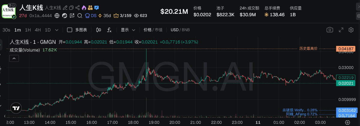 ● „Životní K-line“ spojuje koncept AI mysticismu, 24hodinový nárůst dosahuje 360 %, tržní kapitalizace jednou překonala 3.09 milionu dolarů. Vzestup tohoto tokenu je částečně způsoben tím, že produkt získal reportáž na CCTV a podporou klíčových osobností spojených s Binance.