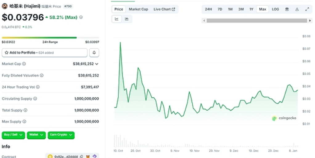 ● „Hakimi“ pochází z japonského anime (Umamusume) jako hovorový výraz, který se na čínském internetu stal virálním trendem „všechno může být Hakimi“. K 8. lednu cena Hakimi byla 0.03796 USD, 24hodinový nárůst byl 10%.