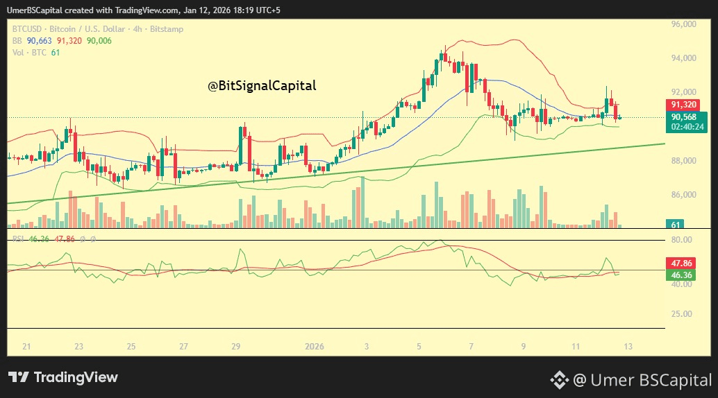 Bitcoin (BTCUSDT) on the 4-hour timeframe is currently trading inside a tight consolidation range after completing a strong impulsive rally followed by a healthy correction. This structure typically appears before a high-volatility expansion.