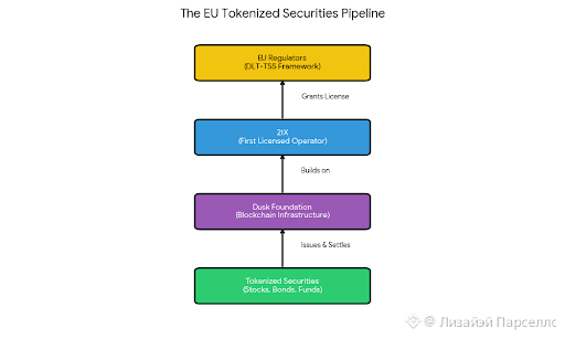 The DLT-TSS license is basically regulatory permission to issue and settle tokenized securities in Europe. Stocks. Bonds. Funds. Real financial instruments worth billions. Not jpegs. Not governance tokens. Actual regulated securities.