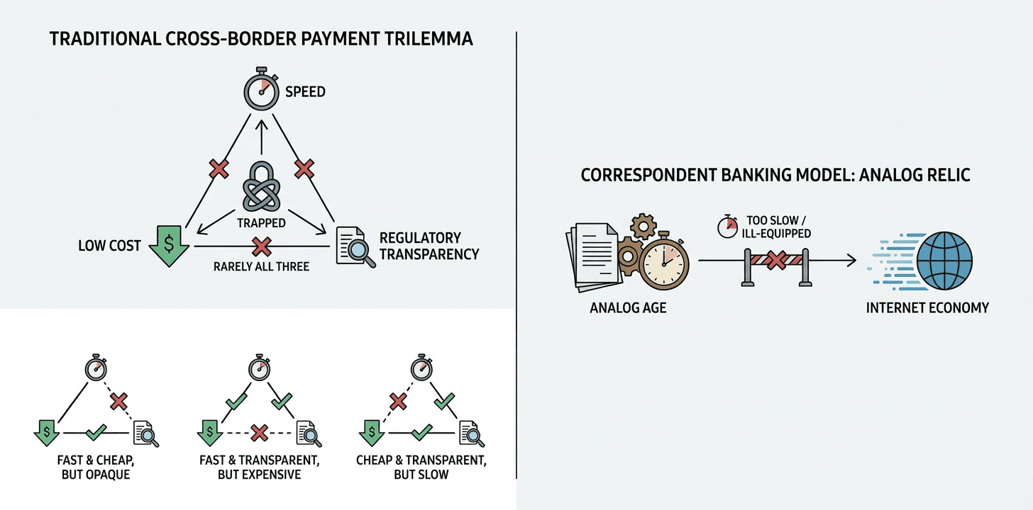 The traditional cross-border payment system is trapped in a structural trilemma: you can have speed, you can have low cost, or you can have regulatory transparency, but you rarely get all three. The current correspondent banking model is a relic of the analog age, ill-equipped for the velocity of the internet economy.