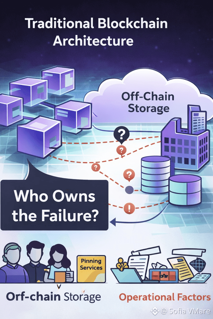 The moment that outcome points to data living off-chain, Walrus asks a question most systems avoid: who owns the failure if that data can no longer be accessed?