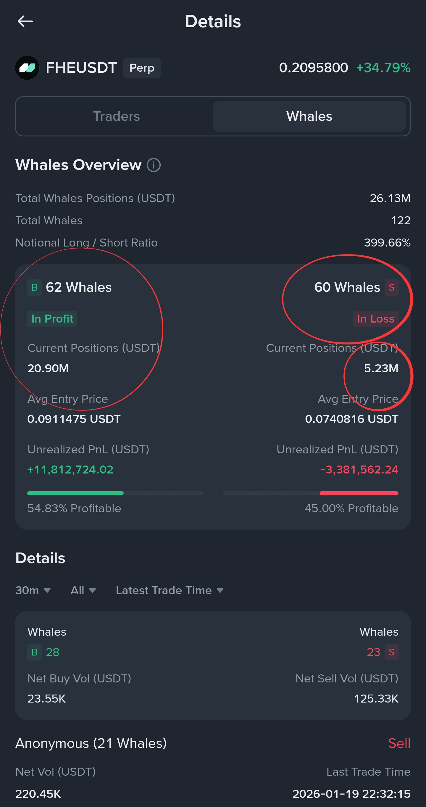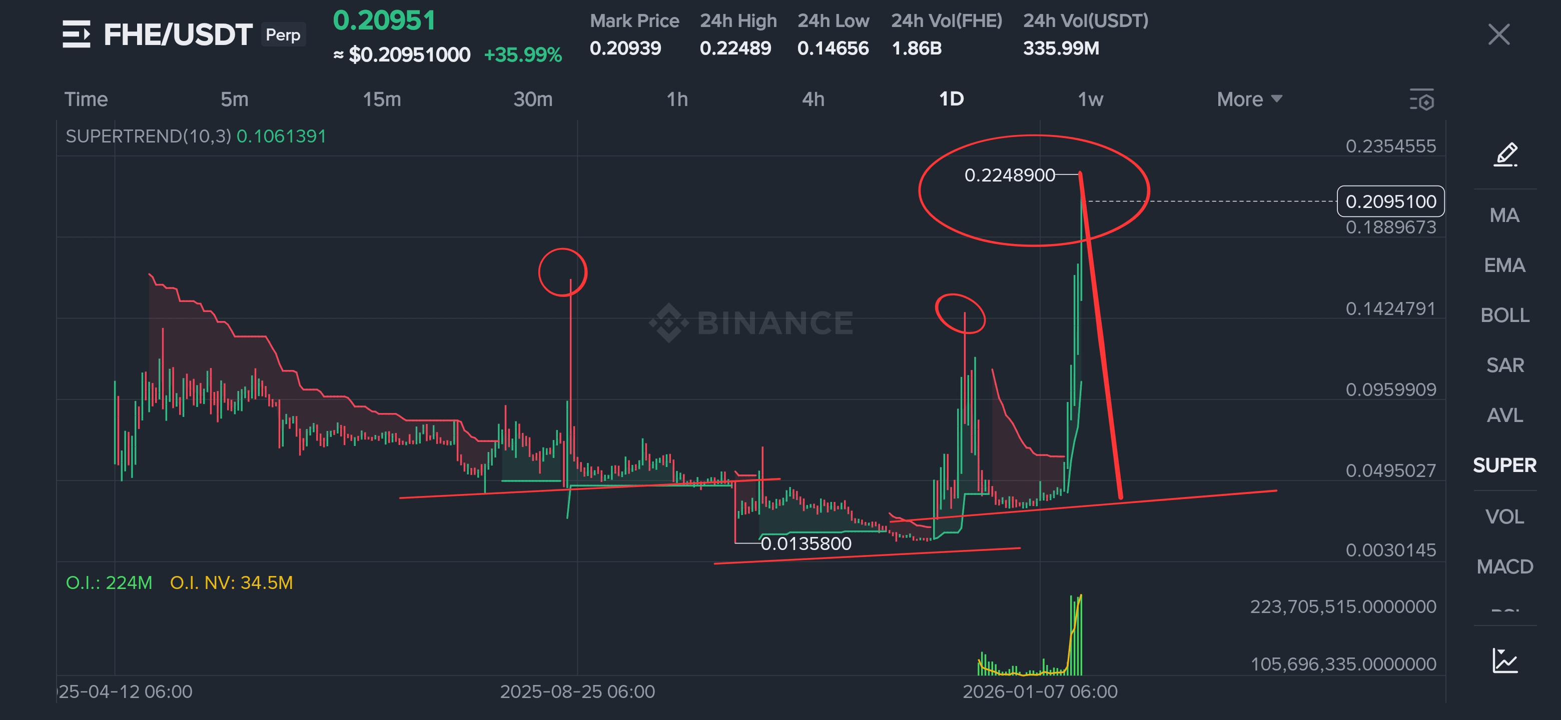 Cena nyní dosáhla zóny $0.22 – $0.23, což představuje první výrazné rozšíření směrem nahoru od základny. Ostré odmítnutí z vysokých úrovní a náhlý výskyt velkých medvědích svíček naznačují, že FHE vstoupilo do zóny vysokého rizika reakce ⚠️.