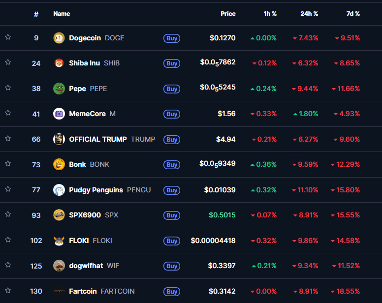 To není jen záležitost FARTCOIN. $DOGE a $SHIB klesly o ~9 %, $PEPE ztratil ~12 %, zatímco nově se objevující jména jako $PENGU a $SPX spadla o více než 15%.