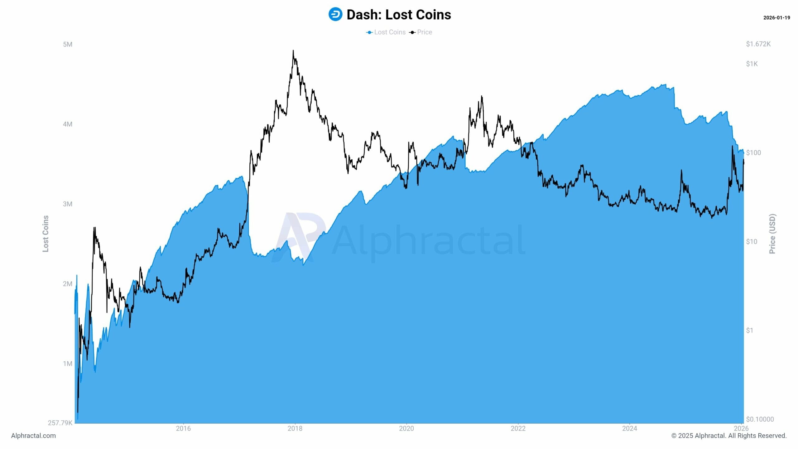 Dalším detailem je, že ztracené mince DASH nebo dlouhodobě nečinná nabídka, po letech růstu, již začínají stabilizovat. Co to znamená?