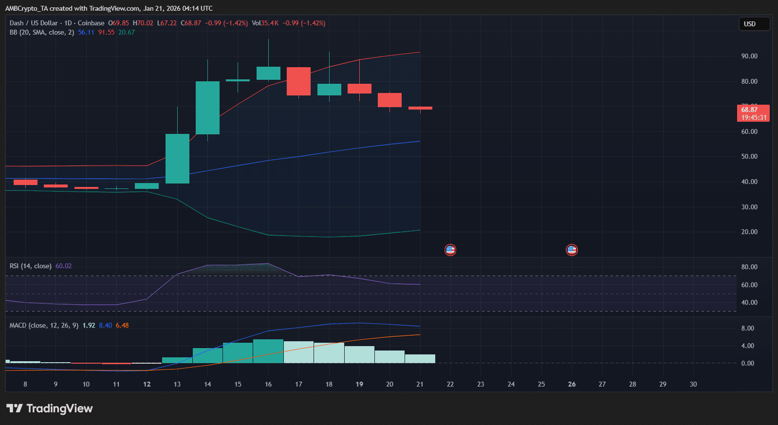 DASH (t-81/) klesá, ale tentokrát to nevypadá jako normální korekce po "příliš velkém nárůstu". Je zvláštní, že tržní nálada je neobvykle klidná - žádný panický výprodej, žádné výrazné nadšení pro nákup na dně, jako by lidé najednou ztratili zájem.