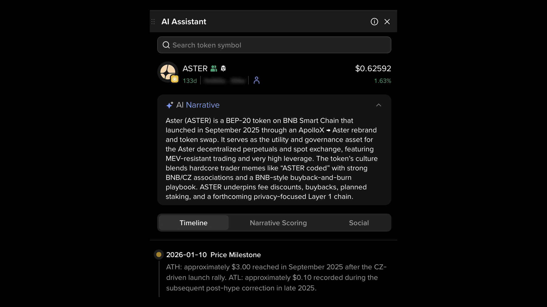 AI Assistant funguje jako interpretační vrstva. Odpovídá na otázky, vysvětluje pojmy a nabízí kontext o tokenech a trendech, aniž by překročil hranici k finančnímu poradenství.