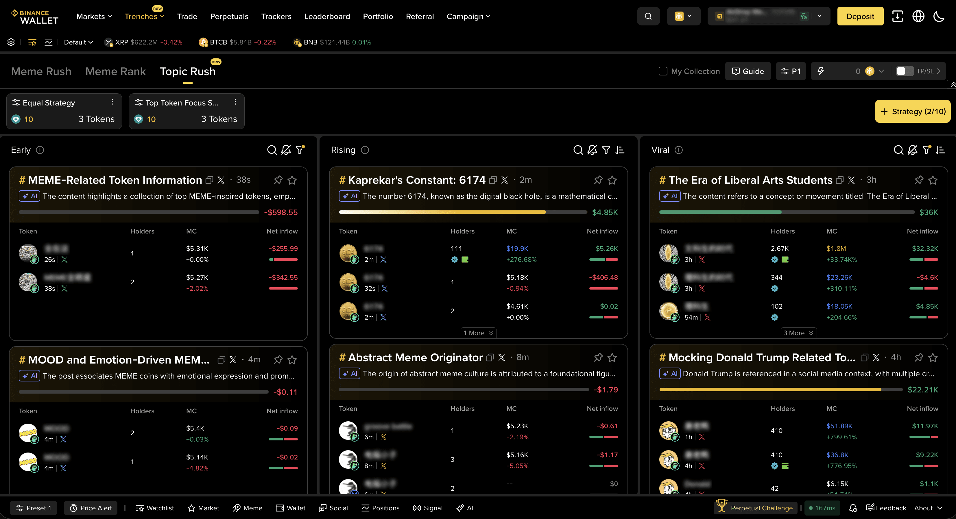 Pokud Sociální Hype odpovídá na "o čem se mluví", Topic Rush odpovídá na "proč to je důležité". Tato funkce seskupuje tokeny a projekty kolem trendových témat, což pomáhá pochopit, jaké narativy přitahují kapitál a pozornost.