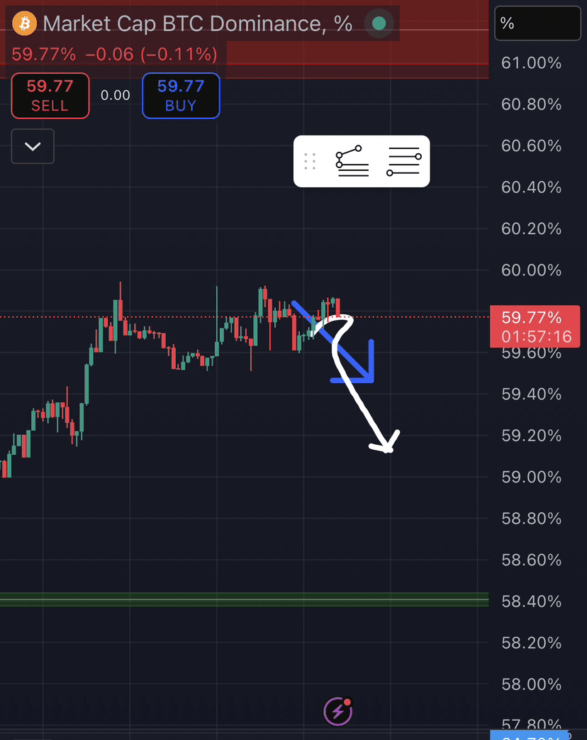 Dominance Bitcoinu nyní jasně ukazuje slabost na 4hodinovém grafu a upřímně, tento klesající trend vypadá již potvrzeně, pokud se na něj dobře podíváte. Z obrázku vidíme, že dominance BTC nedokáže udržet nad silnou zónou a cena začíná směřovat dolů, což obvykle dává altcoinům prostor k dýchání. To není nic nového na kryptoměnovém trhu, mnohokrát, když dominance Bitcoinu klesá, ostatní mince se začnou pomalu probouzet.