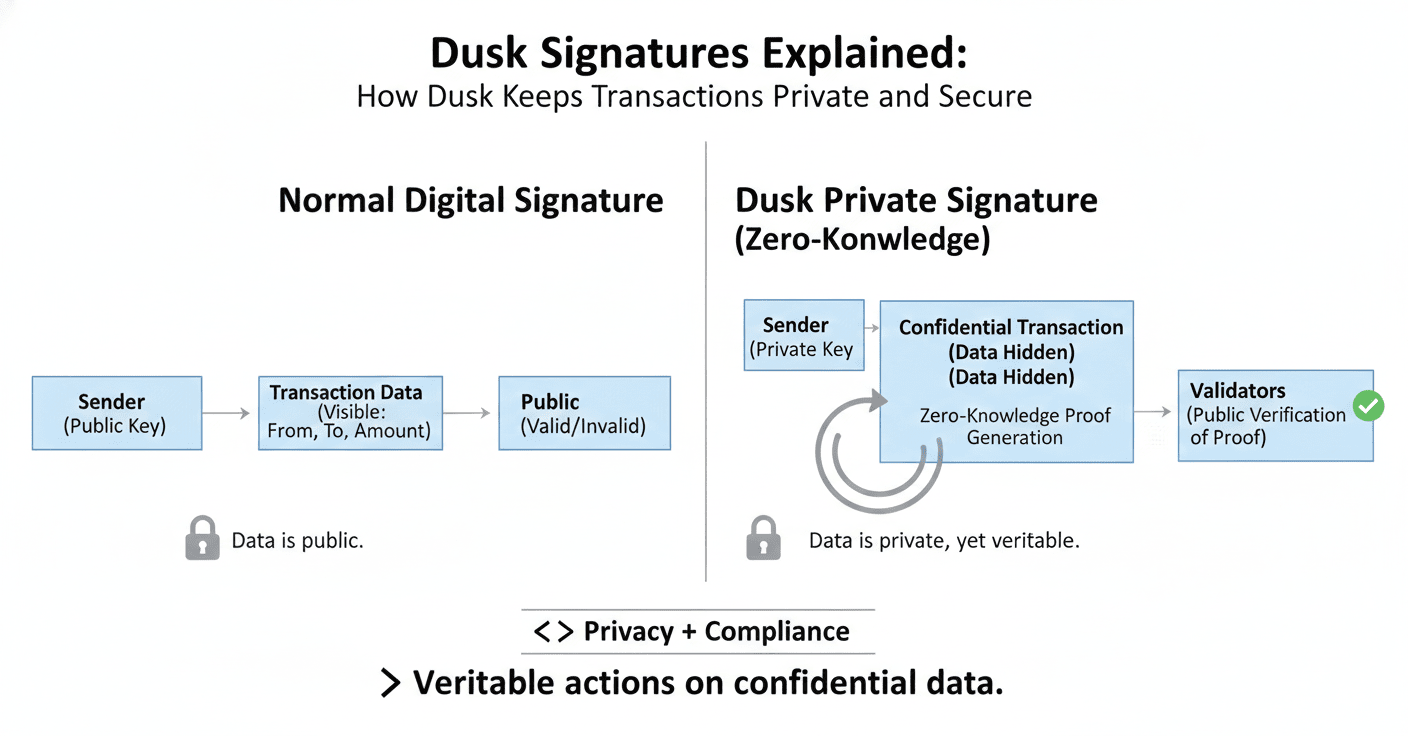V každém blockchainu jsou digitální podpisy základní vrstvou zabezpečení. Důkazují, že transakce je skutečná, že osoba, která ji posílá, vlastní prostředky, a že nikdo ji nemůže změnit. Na Dusk je to ještě důležitější, protože síť je postavena na ochraně soukromí, důvěrnosti a dodržování předpisů. Takže Dusk nepoužívá jen běžné veřejné podpisy. Používá podpisové systémy, které pracují s důkazy s nulovou znalostí a soukromými transakcemi.