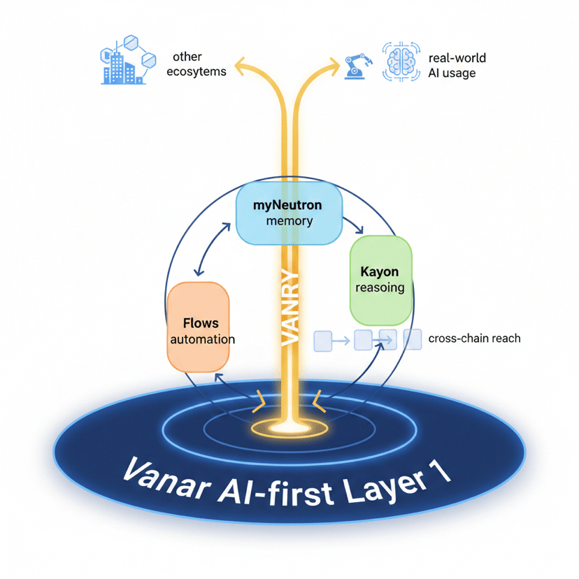 Vanar upřednostňuje vytrvalost a nativní inteligenci před hrubým průchodem. Paměť, uvažování, automatizace a vyrovnání existují na základní vrstvě. myNeutron posouvá sémantickou paměť do jádra. Kayon vkládá uvažování a vysvětlitelnost do blockchainu. Flows převádí inteligenci na řízenou automatizovanou akci.