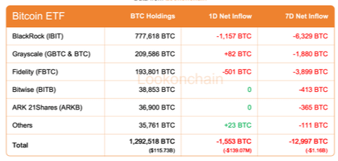Během 7 dnů celkem -12,997 BTC více než 1,16 miliardy USD opustilo ETF fondy v uplynulém týdnu.