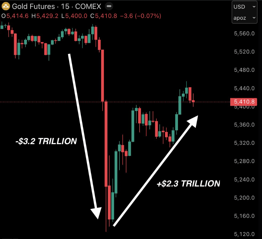 👉Cena zlata se výrazně pohybovala, klesla o 7 % na 5 250 USD pouze během jedné hodiny, před tím, než se dramaticky vzpamatovala do tvaru V. Tržní kapitalizace zlata se pohybovala až na 5,5 bilionu USD během jedné obchodní seance, což je největší denní volatilita v historii. K začátku asijského obchodování v pátek cena zlata opět vzrostla nad 5 400 USD, což představuje přibližně 1 % nárůst.