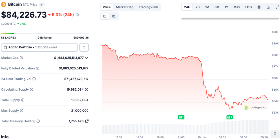 👉Bitcoin klesl výrazně na začátku asijského obchodování v pátek, propadl o více než 5 % z 89 000 USD na nejnižší úroveň 83 400 USD během amerického obchodování. Na rozdíl od zlata nebo akcií se Bitcoin neobnovil, což ukazuje na krizi v rozpoznávání „digitálního zlata“.