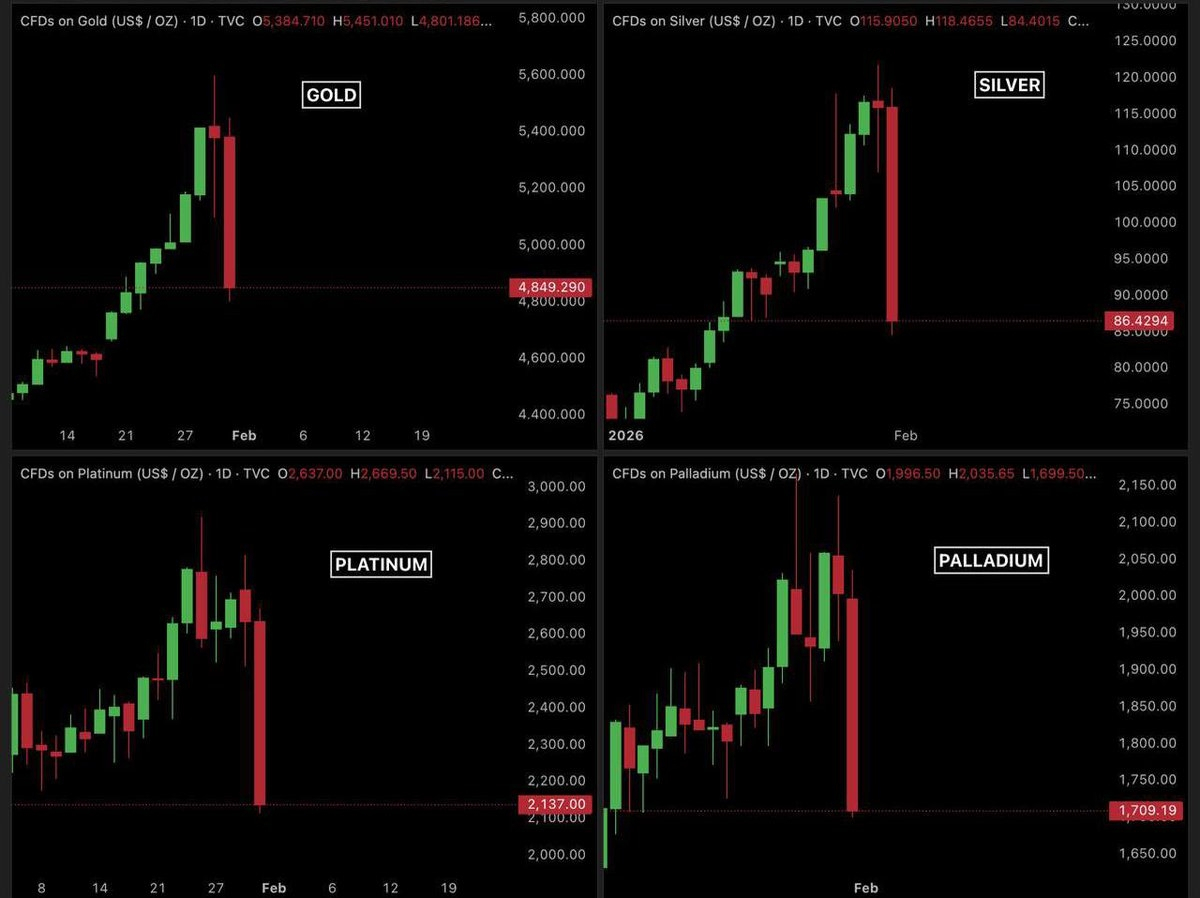 Během méně než 36 hodin trh s drahými kovy po celém světě zažil jedno z nejdrtivějších přizpůsobení za mnoho let. Cena zlata klesla z oblasti 5.600 USD na přibližně 4.700 USD. Stříbro volně padalo z 121 USD na 77 USD. Platina a palladium se také nevyhnula podobnému osudu.