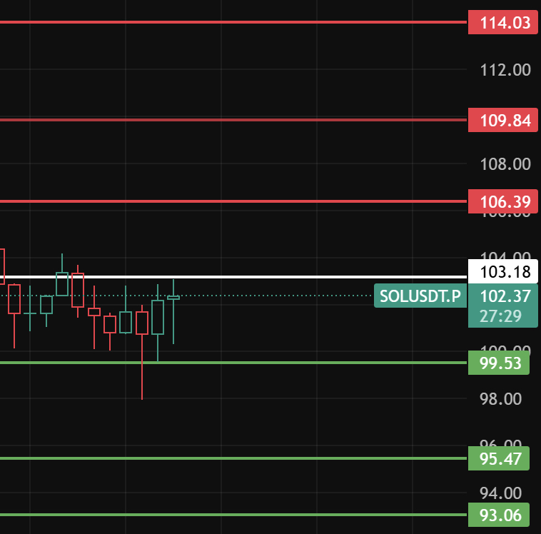 Pokud se dnes odraz neprojeví nad 103, znamená to, že menší odraz nemá sílu. Pokračujte dolů, věnujte pozornost podpěrným úrovním poblíž 99-95-93!#solana