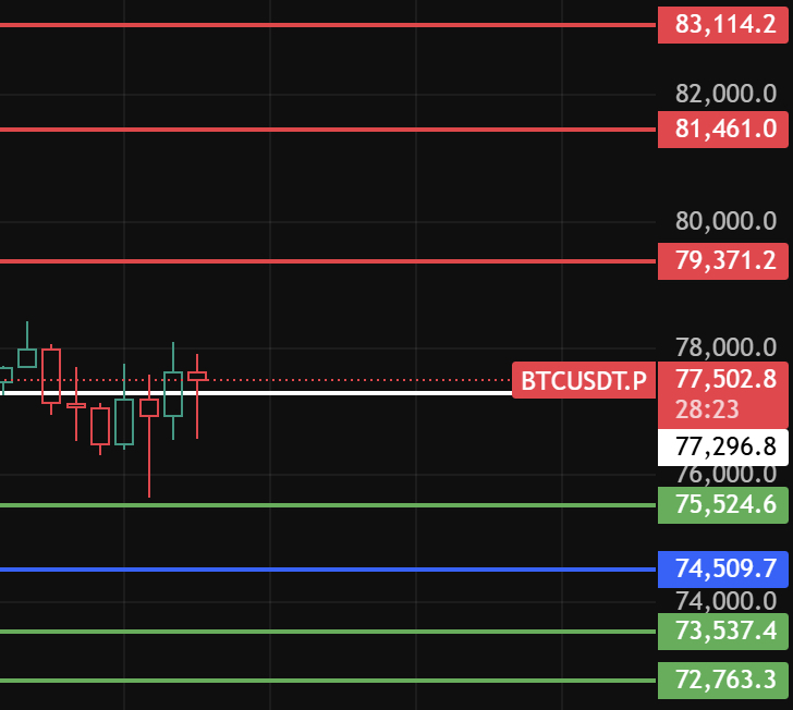 Dnes věnujte pozornost této pozici 77300, pouze pokud se tento bod udrží nad 1 hodinu, začne se odraz. Věnujte pozornost tlakovým úrovním poblíž 79370-81460-83110!