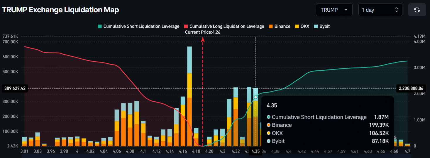 Obchodníci na denní bázi vsazují na pokles. Pokud cena prorazí $4.17, téměř 800K USD long pozic je v ohrožení likvidace.