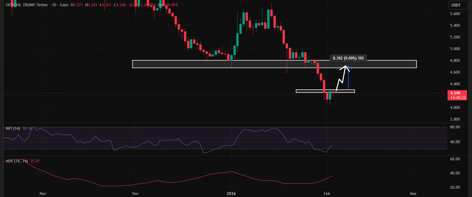 TRUMP čelí pevnému zdi na $4.30. Cena se úspěšně nezdařila prolomit tuto hladinu po dobu posledních 3 dnů.